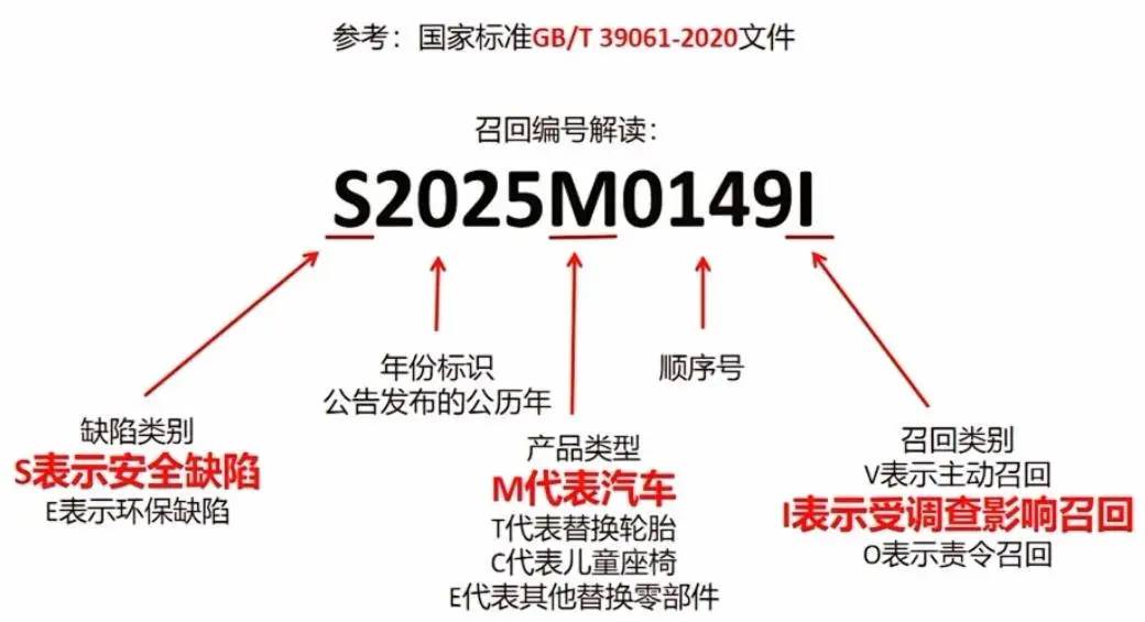 根据国家标准,汽车产品召回编号,首字母表示缺陷类别:S是安全缺陷,E是环保缺陷;尾字母表示缺陷类别:V是主动召回,I是受调查影响召回,O是责令召回。