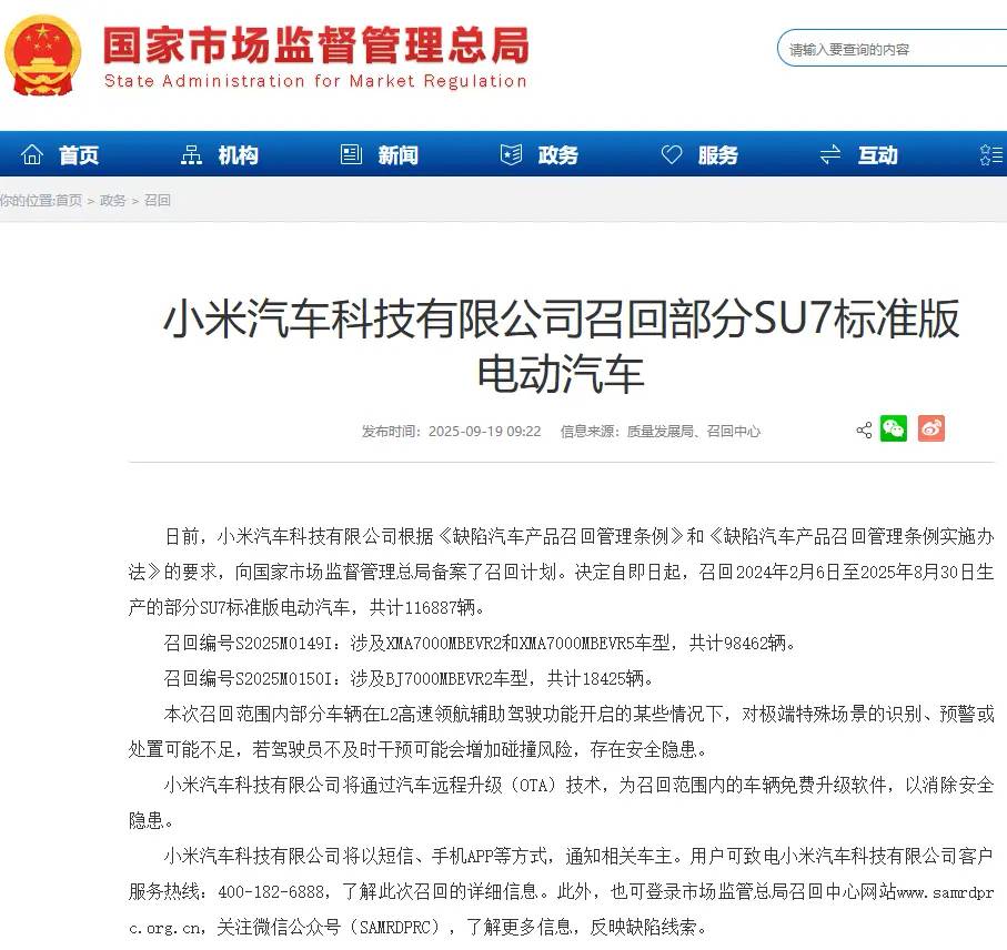 9月19日,国家市场监督管理总局公告显示,小米汽车召回2024年2月6日至2025年8月30日生产的部分SU7标准版电动汽车,共计116887辆。