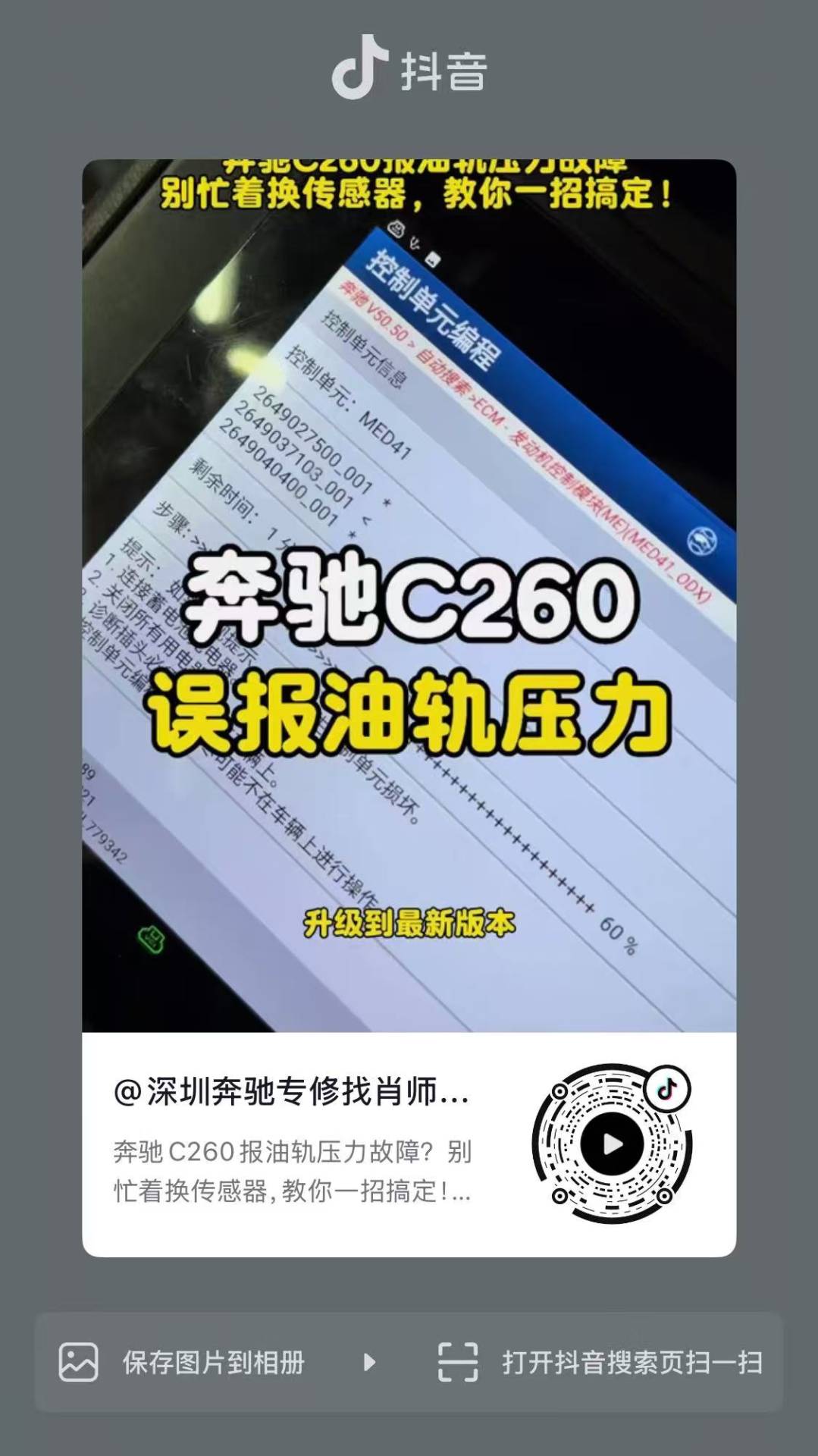 奔驰E260 报“燃油压力传感器功能故障”? 很多车主被建议更换昂贵的高压油泵和传感器。 维修方案: 在线编程升级。 原理揭秘: 厂家后期推出了优化补丁,通过更新发动机ME电脑程序,解决因逻辑设定导致的误报。 肖师傅提醒: 修奔驰要讲究“先软后硬”,先排除程序问题,再考虑硬件更换。 深圳奔驰专修:用最合理的方案,解决最烦人的通病。