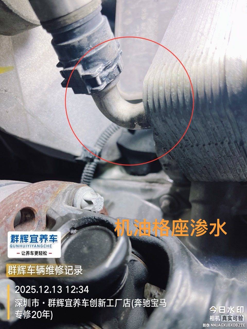 - 机滤座端:进气歧管下方的机油滤清器底座垫片老化,出现渗油渗水现象。